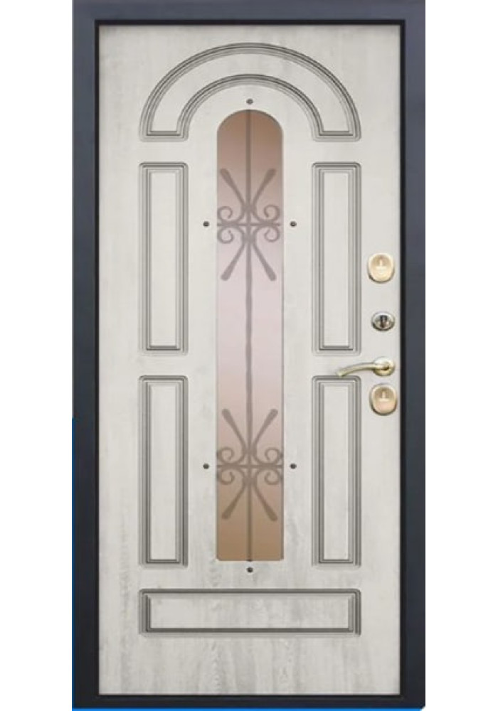 Отделка снаружи: Лист стали 1.2мм + МДФ панель 12мм ламинированная пленкой Винорит (Израиль) с патиной , цвет Грецкий орех» с патиной Стеклопакет, Ковка