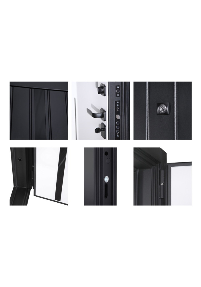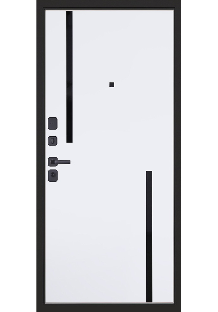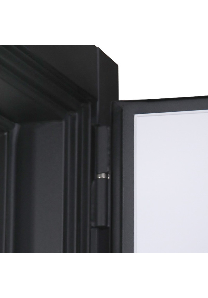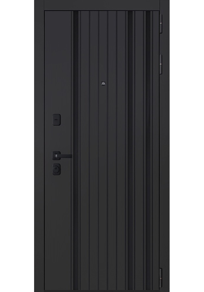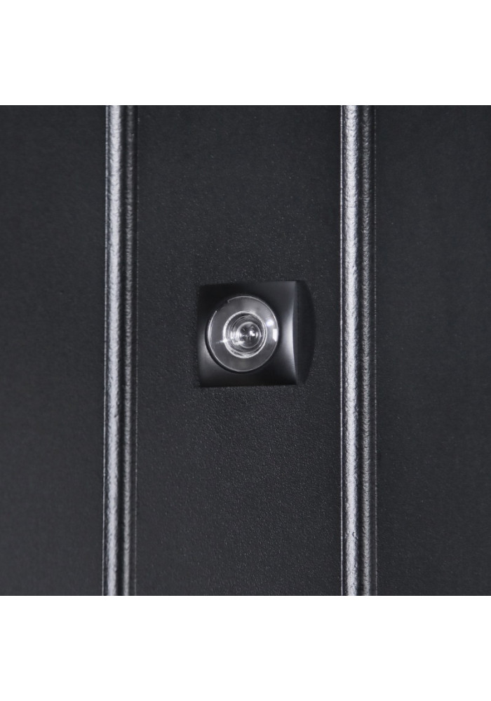 - Наружный лист металла: Лист металла 1,5 мм. Панель МДФ 10 мм (цвет "черная шагрень"). Объемная фрезеровка. Вертикальные вставки из пластика 3 шт (цвет "черный"). Наличник МДФ 80 мм.