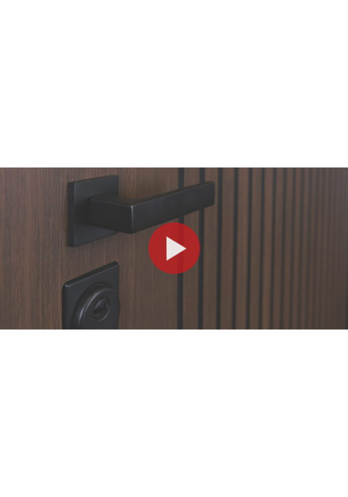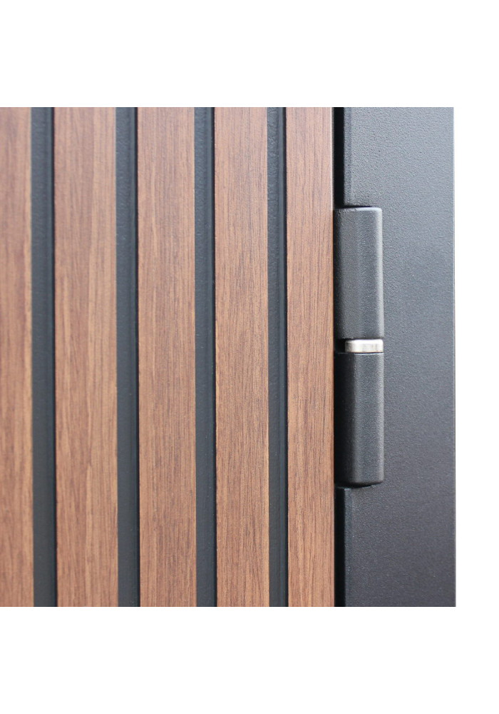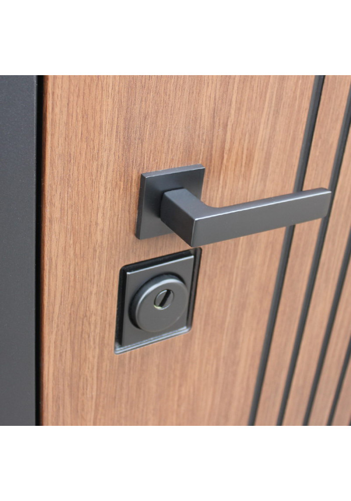- Наружный лист металла: Лист металла 1,5 мм. Экошпонированная дизайнерская панель МДФ 10 мм. Линейная фрезеровка. Цветовая комбинация: "дуб кантри темный", черное патинирование по фрезеровке. Наличник МДФ гладкий 80 мм., цвет "черный кварц".